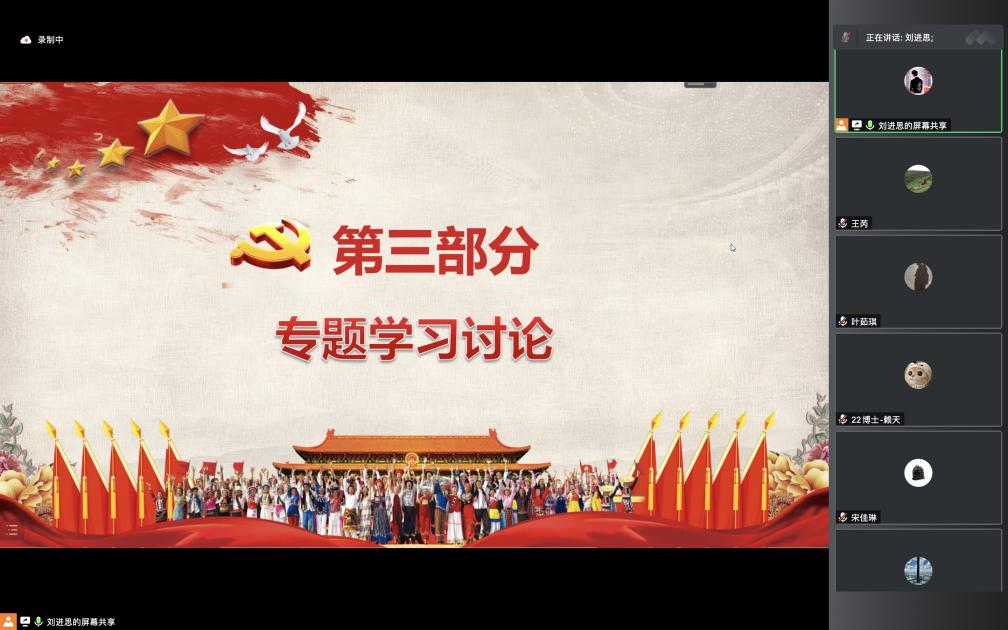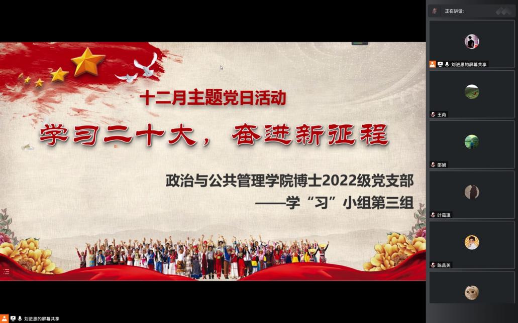 在兩(liang) 位講師領學完成後,2022級博士黨(dang) 支部全體(ti) 與(yu) 會(hui) 黨(dang) 員先後就本次黨(dang) 日活動主題發表了各自的學習(xi) 感悟,就如何將二十大報告精神與(yu) 個(ge) 人專(zhuan) 業(ye) 學習(xi) 和日常生活結合起來分享了各自想法。