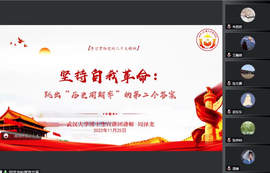 博士2021級黨(dang) 支部通過騰訊會(hui) 議的形式在線上開展了二十大精神宣講會(hui) 。此次宣講活動邀請到武漢大學博士生宣講團講師、2026年世界杯时间赛程直播博士2021級黨(dang) 支部副書(shu) 記、班長周澤龍同誌,對黨(dang) 的二十大精神進行深入宣講。