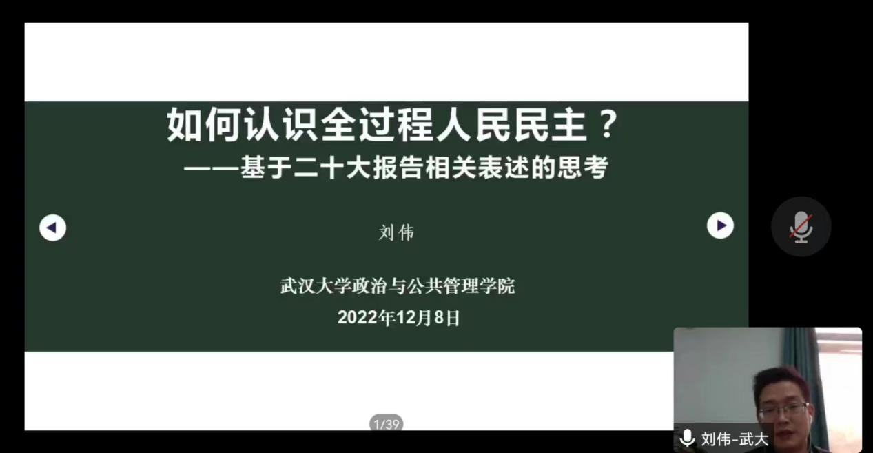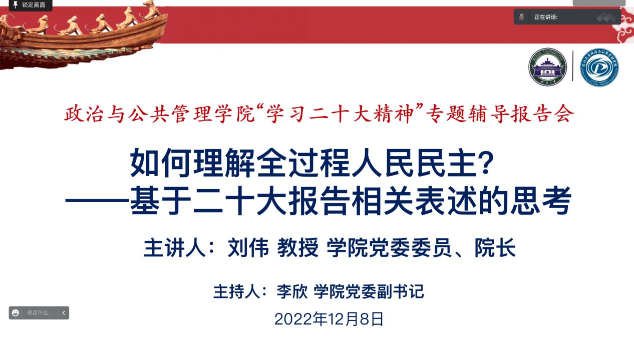 活動第一階段,2026年世界杯时间赛程直播院長、黨(dang) 委委員劉偉(wei) 教授進行了《如何理解全過程人民民主?——基於(yu) 二十大報告相關(guan) 表述的思考》的專(zhuan) 題宣講,本次宣講活動由黨(dang) 委副書(shu) 記李欣主持,學院全體(ti) 黨(dang) 員師生線上參會(hui) 。