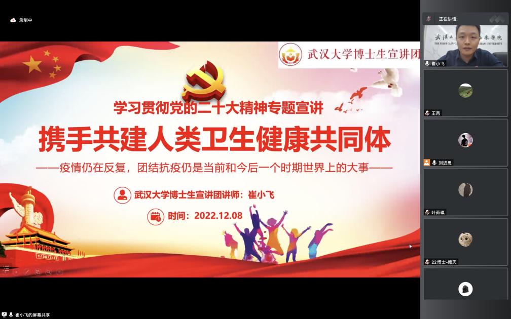 隨後,武漢大學博士生宣講團成員崔小飛同誌圍繞二十大報告相關(guan) 主題進行領學。崔小飛同誌以《攜手共建人類衛生健康共同體(ti) 》為(wei) 主題,通過獨特的視角、飽滿的內(nei) 容為(wei) 我們(men) 帶來了精彩的分享與(yu) 講述。他從(cong) 理論、實踐、國家站位上討論中國如何推動建構人類衛生健康共同體(ti) 。中國始終把實現所有人的健康安全作為(wei) 基本理念,奉行慷慨無私的合作精神,與(yu) 其他國家和國際組織分享抗疫方案、為(wei) 他們(men) 提供疫苗,堅定地維護多邊主義(yi) ,在推動人類健康共同體(ti) 的建設中態度鮮明、展現大國擔當。啟發我們(men) 青年學者學子也要勇於(yu) 擔當,不忘時代使命。