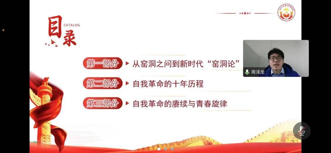 周澤龍同誌從(cong) “從(cong) 窯洞之問到新時代窯洞論”“自我革命的十年曆程”“自我革命的賡續與(yu) 青春旋律”三個(ge) 方麵切入,結合個(ge) 人學習(xi) 心得,以及掛職實踐經曆,用通俗易懂的語言、真實的故事,將黨(dang) 的二十大精神講述得有溫度、有力度、有畫麵,引起了大家的強烈反響與(yu) 共鳴。