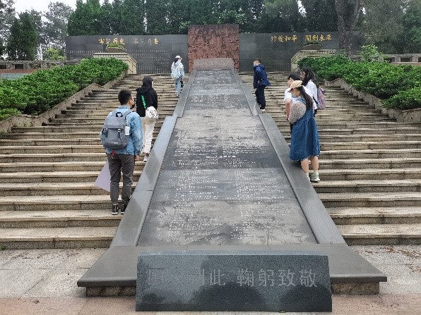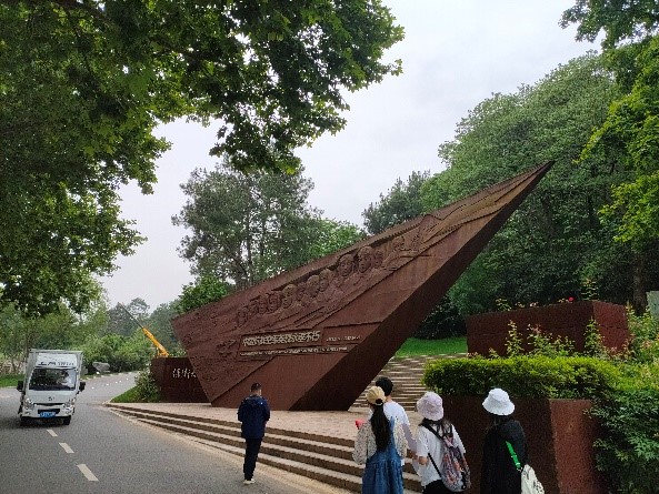 武漢抗戰紀念園位於(yu) 武昌石門峰,由紀念園主入口廣場、武漢保衛戰紀念牆和英雄廣場組成。在中華民族的曆史長河中,抗日戰爭(zheng) 可歌可泣,它是中國近百來,最堅決(jue) 、最徹底的一次維護主權、抵抗外侮的戰爭(zheng) 。在這場長期的、大規模的抵禦外侮的戰爭(zheng) 中,武漢一度成為(wei) 抗戰的臨(lin) 時首都,起到了號召全國人民起來抵禦日本侵略的精神導向作用。目前已建成幾麵宏大的武漢會(hui) 戰殉國烈士紀念牆,銘刻著數千名武漢會(hui) 戰烈士的姓名、籍貫、軍(jun) 銜、部隊番號、陣亡地點。紀念牆上赫然銘刻著胡錦濤總書(shu) 記對中國抗日戰爭(zheng) 紀念提出的“牢記曆史、不忘過去、珍愛和平、開創未來”16字方針。沿著載滿武漢抗戰大事記的階梯扶級而上,學員們(men) 不時駐足觀望,回望曆史,熱血噴張,豪情激蕩;順著山路而下,鐫刻著“中國抗戰空軍(jun) 英烈永垂不朽”字樣的紀念碑、挺立著的眾(zhong) 多湖北籍革命先烈的塑像依次映入眼眶。方寸之間,黨(dang) 史百年,初心不忘,再續前章。