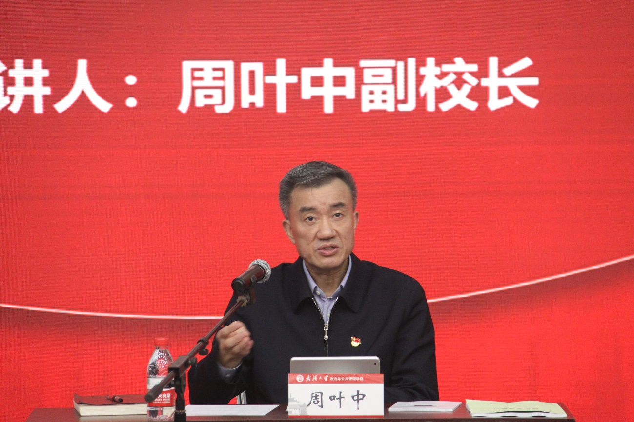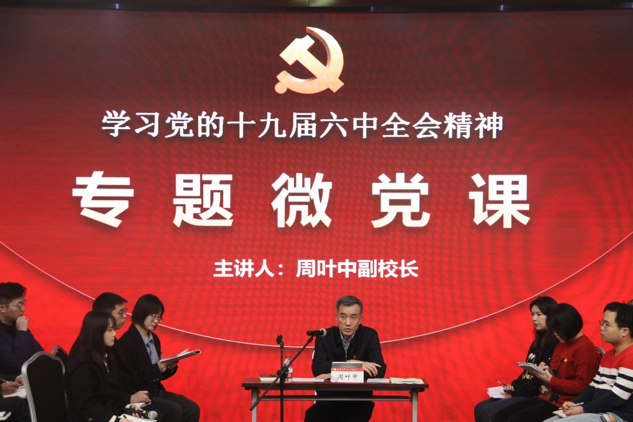 12月8日下午,學院黨(dang) 委邀請副校長周葉中教授為(wei) 學院師生做黨(dang) 的十九屆六中全會(hui) 精神學習(xi) 輔導報告,宣講黨(dang) 的十九屆六中全會(hui) 精神。學院黨(dang) 委理論學習(xi) 中心組全體(ti) 成員,幹部、教師及學生代表120餘(yu) 人參加了報告會(hui) ,學院黨(dang) 委副書(shu) 記邢濤主持報告會(hui) 。